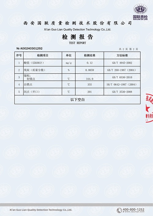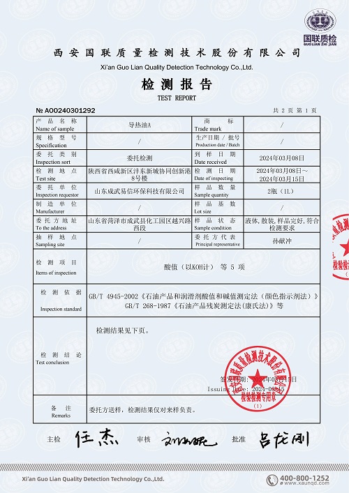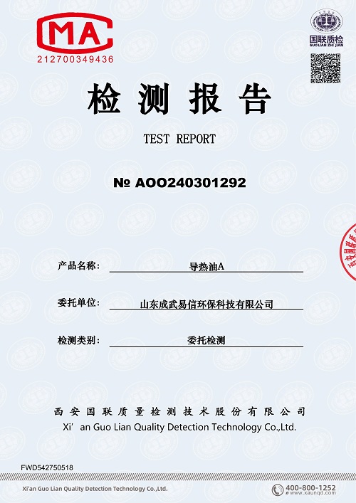 山東成武易信環(huán)??萍加邢薰?20噸導(dǎo)熱油系統(tǒng)清洗后使用半年后的導(dǎo)熱油檢測報告